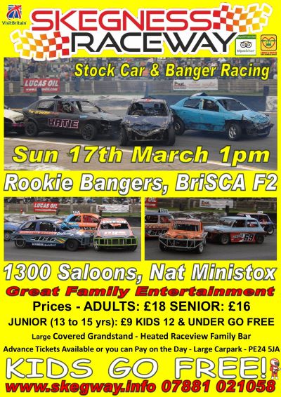Details Bookings Meeting Format Prices, Times & More Last Updated: 04th April 2024 09:57 17th March 2024 PreviewBriSCA F2, 1300 Saloons, Rookie Bangers, National Ministox Our second event of 2024 and good numbers booked. BriSCA F2 Stock Cars, 1300 Saloons, Rookies Bangers and the kids in National Ministox. A full day of contact racing Don't let a forecast put you off, we don't cancel. Large covered grandstand. The show goes on. All now pay on the day, we have a large capacity we won't sell out. We are thrilled to be welcomed into the Trip Advisor Hall of Fame with our Certificate of Excellence and we have a 4.7 out of 5 rating on google. You really should be coming along to Skegness Raceway to be part of the excitement & fun that lots of people are talking about and have had a great time over the last few years. We are also members of Visit Britain and Visit England. Skegness Raceway is also home to the famous ‘SKEG VEGAS’ Sign. Skegness Raceway boast fantastic facilities We have a large undercover Grandstand on the back straight, if you prefer to watch from outside, the arena is raised terracing so plenty of unhindered viewing. We also have Bars (including our family Raceview Bar, air con or heated), shops, catering, toilets, disabled toilets and baby changing facilities. We have no direct seating, large tyres are banked in on each bend which do create a seating area. You are welcome to bring your own chairs. The seaside end allows a great area for wheelchair viewing. We have some ongoing improvements at the raceway, Please bear with us as we continue to upgrade the Raceway. The New seated covered grandstand on the home straight isn’t open as yet, we will update when it is available. Sorry there isn’t a cash machine at the raceway, you can pay cash or card but be aware we don’t have card machines in the bars and cash payment is quicker in the shops. Due to the Raceway location we struggle for a signal with mobile card machines. Large free carpark adjacent to the stadium f you require a pits wristband, just ask at the turnstiles when you pay. You can also go to the pit office, which closes at 1pm. Please note the Pit Office is cash only. Disabled parking is situated near the turnstiles (please don’t park in front of the turnstiles), would recommend early arrival to secure a space. Trackside parking no longer available (hasn’t been since 2017) and there is also no longer a bus service to the Raceway, we do have a free car park. Note. Large quantities of food and drink are not allowed to be brought in to the Stadium arena. You may enter the Stadium with a small amount of food and non- alcoholic beverage suitable for one person’s consumption ie. Sandwich, packet of crisps and bottle of soft drink. We will not allow cooler boxes, holdalls, shopping bags, backpacks etc. filled with refreshments. Nor will we allow trays, packs crates etc. of soft drinks. STRICTLY NO ALCOHOL or GLASS. Alcohol will be confiscated If you have specific dietary requirements for health reasons, please bring a confirmation letter with you from your GP. We race in all weather conditions. Well behaved dogs on leads are allowed to be brought into the venue. No tents, shelters, gazebos, marquee’s, pop up tents or similar are allowed inside the Stadium Arena. If you click on ‘Info’ on the website it gives full details on the Raceway including accessibility, formulas, stunts etc BriSCA F2 3 Liam Rennie 9 Harley Thackra 22 Dave Gallagher 44 Kyle Taylor 47 Greg McKenzie 88 Luke Grimer 129 Charley Tomblin 161 Ben Bate 177 Noel whinney 183 Charlie Guinchard 200 Amy Webster 213 Tom Bennett 238 Lewis Smith 285 Caiden Morrison 291 Dan Baker 296 Charle Doe 335 Jake Woodhull 355 Aiden Grindey 376 Daz Seneschall 381 Sam hooker 386 Dan Petters 390 Jessica Smith 435 Adam Paling 461 Tom Davison 482 Dale Seneshall 501 Jason Ward 514 Reece McIntosh 560 Luke Wrench 564 David Shearing 581 Dan Fallows 588 Mike Kingston 606 Andrew Palmer 611 Josh Winch 705 Martin smith 727 Luke Syrett-Barsby 749 Ben Aimson 776 Dan Roots 903 Ben Spence 915 Jamie Jones 931 Rebecca Smith 925 Jake Wilson 926 Josh Wilson 939 Andrew Bentley 960 Aidy Whitehead 975 Graeme Leckie 992 Harley Burns Rookie Bangers 2 Callum Walker 8 Dalton Leedell 26 Ricky Hodson 28 Dale Leedell 36 Brandon Pesterfield 43 Nicky Bishop 49 Jack Coupland 57 George Boult Jnr 97 Jak ellmer 98 Levi Dewey 128 Joe lancaster 204 Philip Mylett 206 Mikey Mylet 211 Joe Couldwell 221 Jordan Storr 223 Shane Batey Jnr 251 Lewis Wietrzyk 252 Kieran Wietrzyk 319 Leigh Dodes 323 Billy Storr 361 Chris Walden 362 Katie Walden 363 Jordan Pesterfield 367 Kelsa Walden 369 Ryan Armstrong 512 Kieron Rowe 793 Owen Greenhalgh 862 Brayden Milner 864 Derran Milner 875 Clinton Haw 881 Shane Brown 993 Ryan Nieuwenburg 1300 Saloons 1 Sam Lawie 8 Roger Barnes 13 Ethan Hill 14 Harrison Careless Veall 31 Dale Church 32 James church 52 Matt Neesom 111 Richard Smith 170 Chris Holland 241 James McDonnell 254 Cameron Brooker 258 Lewis Cooper 288 Gavin Charlesworth 414 Mark Veall 466 alan lakey 515 Lee Veall 704 Matt Dawson 825 Graham Cooper 889 Matthew Clements 999 Mitchell beaumont National Ministox 5 Harry Sworder 20 Freddie Hunter-Johnson 24 Jacob Adkins 30 Charlie Locker 51 Joelan Maynard 69 Josh Hattersley 77 Harry Earl 80 Caitlin Morrison 81 Kai Rushby 91 Amber Sutton 99 Jack Clayton 102 Rhuben Hardwick 103 Charlie Hardwick 105 Danny Bonner 113 Savannah Montgomery-Brown 115 Tommy Madden 118 Tegan Davis 155 Archie Grindey 158 Harry Clement 174 Finley Kew 183 Mason Whittle 219 Olie Wilcox 220 George Englestone 244 George Woodcock 263 Jayden Worrall 269 Freddie Rogers 272 Luca Hodgson 369 Ruby Lomax 402 Elliott Webster 411 Keiran Lanckham 425 Boden Murfin 496 Thomas Holcroft 507 Dara McInerney 532 Taylor Kitson 611 Jamie Hanson 711 Cody Hanson 732 Brooke Kitson 848 Archie Brookes Sun 17th March 1. BriSCA F2 Heat 1 2. BriSCA F2 Heat 2 3. National Ministox 4. Rookie Bangers Heat 1 5. 1300 Saloons Heat 1 